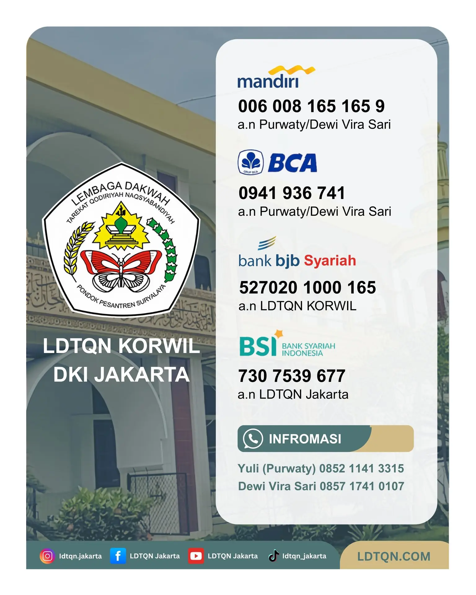 Mari sisihkan sebagian rezeki melalui LDTQN Jakarta untuk membantu mereka yang membutuhkan. Donasi Anda, sekecil apa pun, sangat berarti.