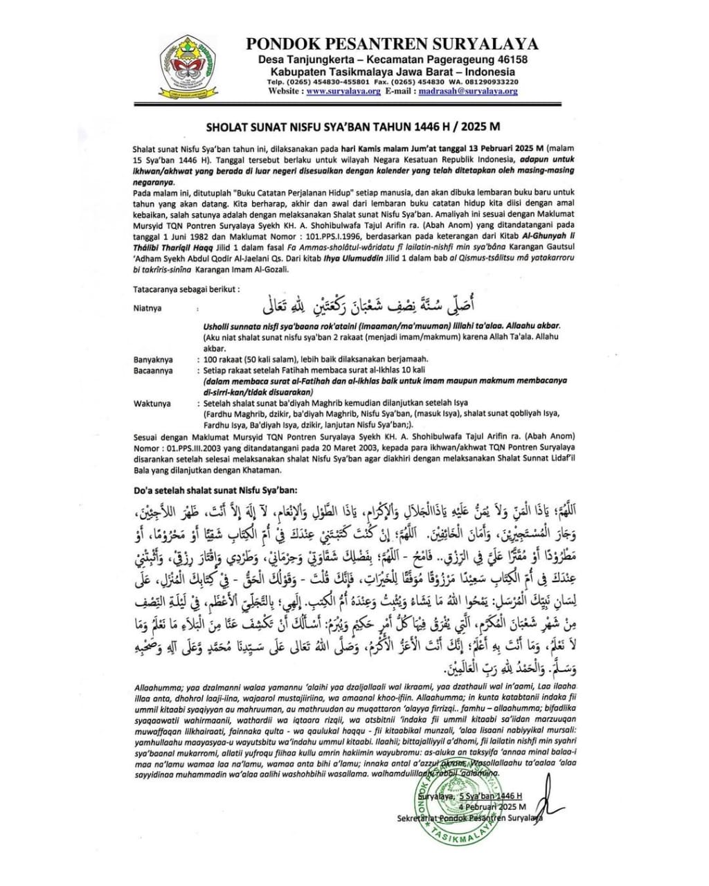 Berikut kami sampaikan Jadwal Shalat Sunat Nisfu Sya'ban, pada hari Kamis, 13 Februari 2025 ( 15 Sya'ban 1446 H ) mulai Shalat Maghrib berjamaah s.d selesai.