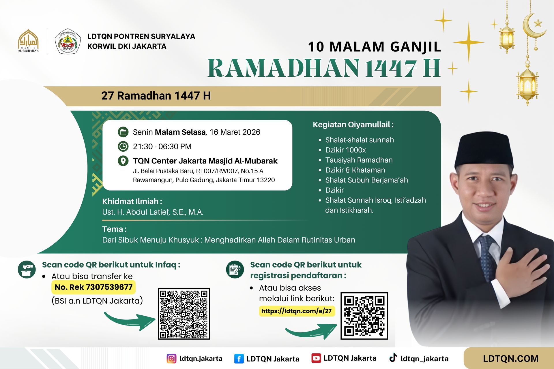Dalam rangka menyemarakkan malam-malam penuh keutamaan tersebut, LDTQN Pontren Suryalaya Korwil DKI Jakarta mengundang kaum muslimin untuk hadir dalam kegiatan Qiyamullail 10 Malam Ganjil Ramadhan 1447 H.