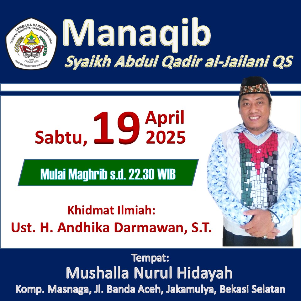 Bersama ini kami mengundang serta mengharapkan kehadiran Bapak/Ibu/Sdr/i untuk dapat hadir pada acara MANAQIB TUAN SYAIKH ABDUL QADIR AL JAILANI QS yang insya Allah akan dilaksanakan pada :