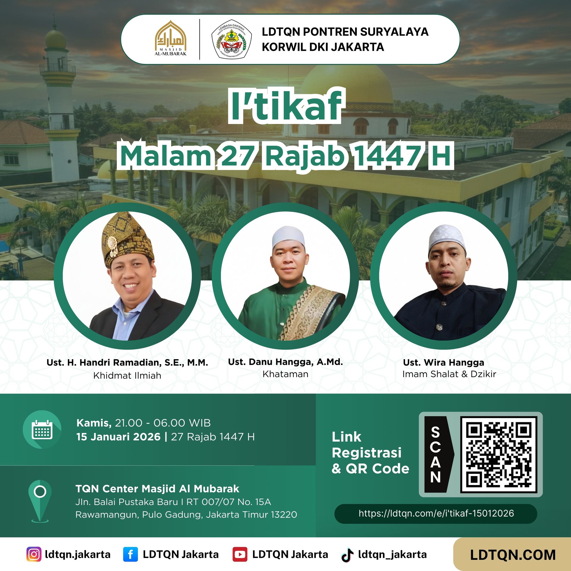 LDTQN Pontren Suryalaya Korwil DKI Jakarta mengundang ikhwan dan akhwat untuk mengikuti kegiatan I’tikaf Malam 27 Rajab 1447 H, yang insyaAllah akan dilaksanakan pada: