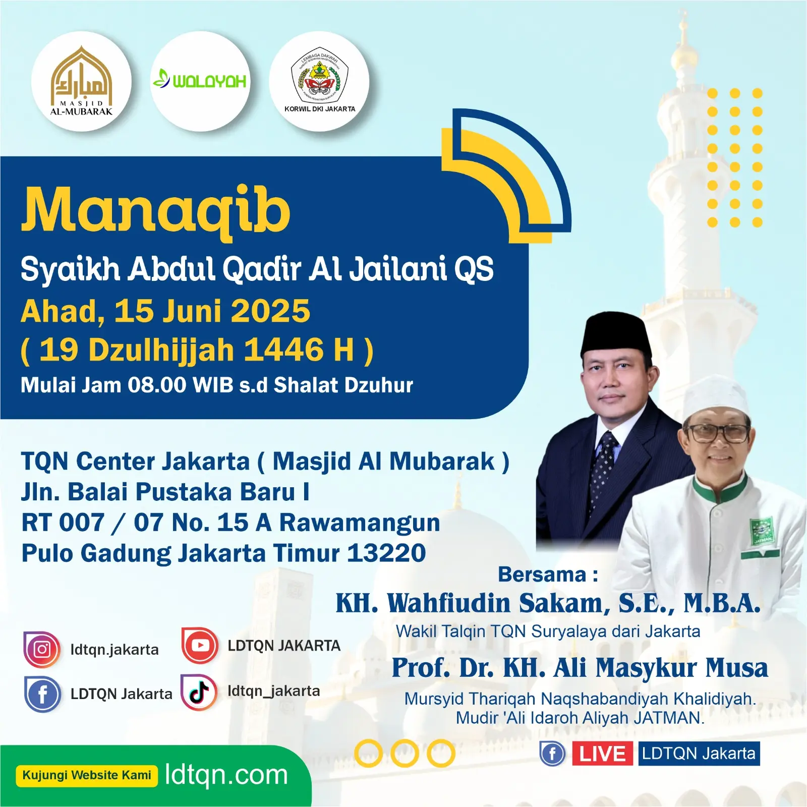 Tempat : TQN Center Jakarta Masjid Al-Mubarak, Jl Balai Pustaka Baru I RT 007/07 No. 15 A, Rawamangun Pulo Gadung Jakarta Timur 13220 (di belakang RS Dharma Nugraha, 100 meter dari perempatan Pospol Jln. Pemuda).