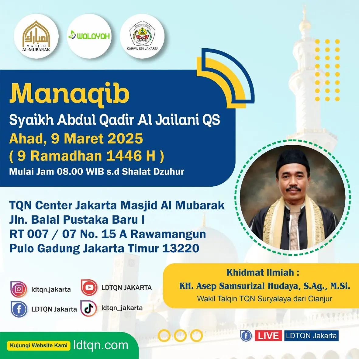 TQN Center Masjid Al Mubarak. Jln. Balai Pustaka Baru I RT 007/07 Rawamangun Pulo Gadung Jakarta Timur 13220._(Persis di belakang RS. Dharma Nugraha)_