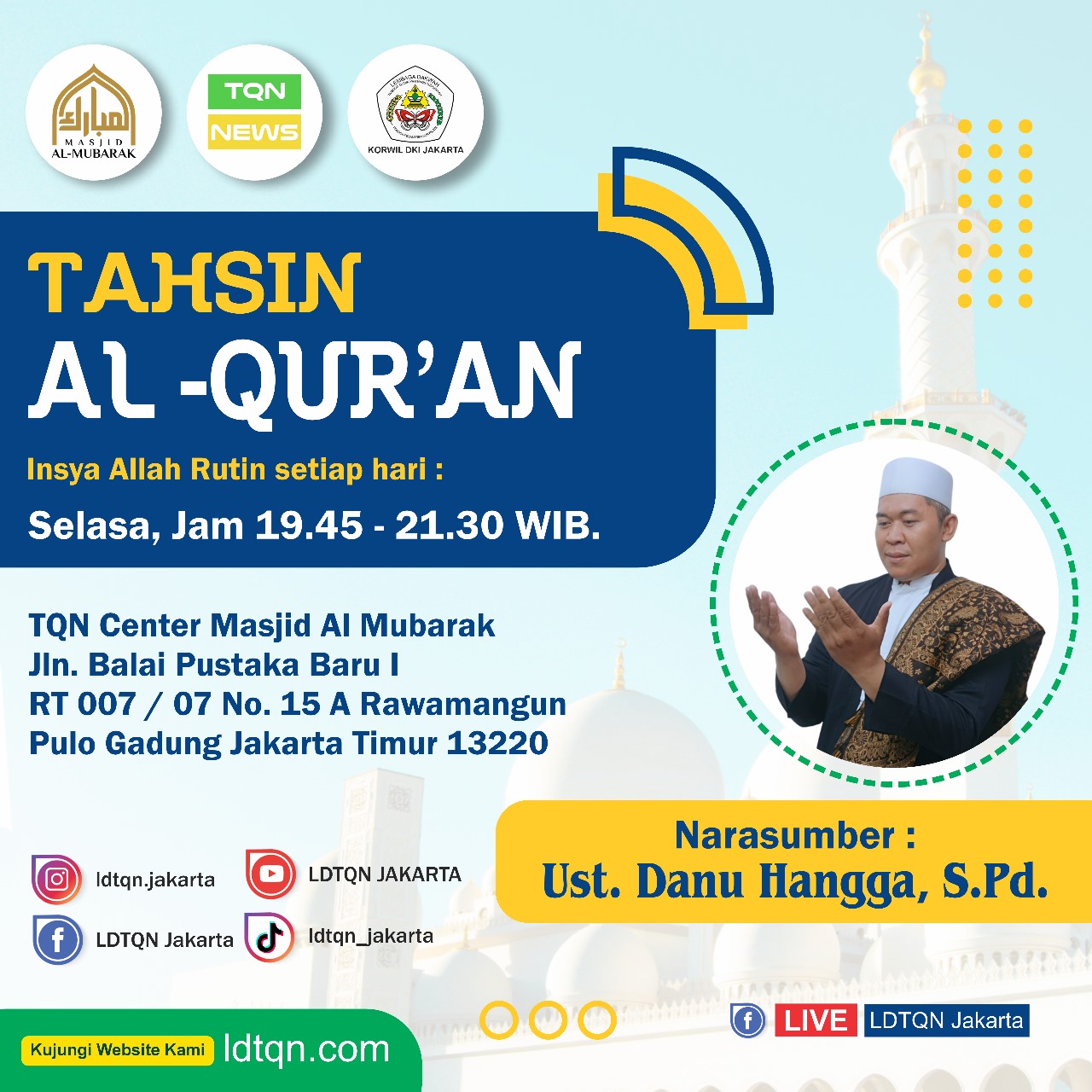 - Tempat : TQN Center Jakarta ( Masjid Al Mubarak ). Jln. Balai Pustaka Baru I RT 007/07 No. 15 A Rawamangun Pulo Gadung Jakarta Timur 13220 (di belakang RS. Dharma Nugraha).