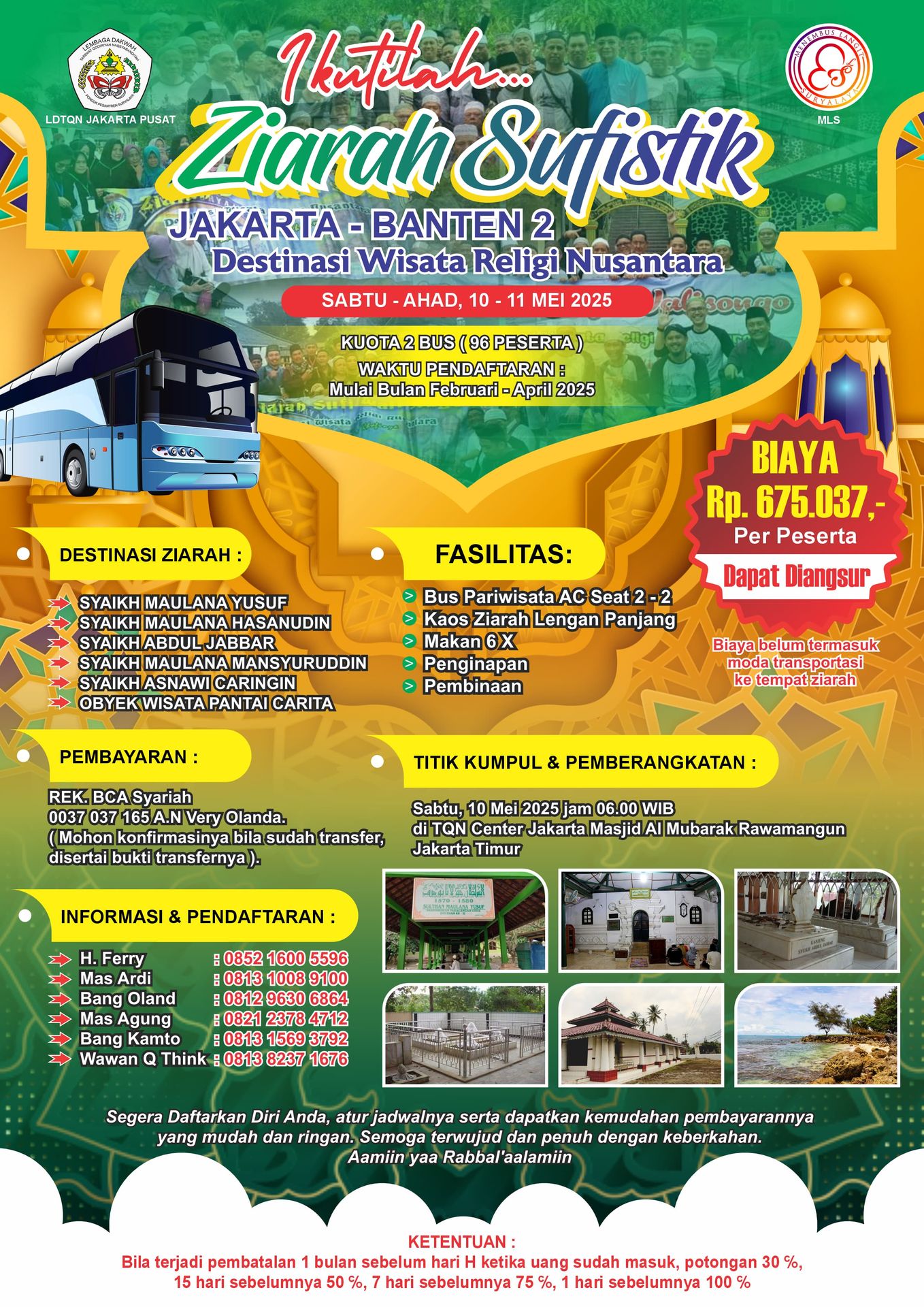 Komunitas Menembus Langit Suryalaya ( MLS ) bersama LDTQN Jakarta Pusat kembali akan mengadakan kegiatan ZIARAH SUFISTIK dengan tujuan JAKARTA - BANTEN yang Ke-2 yang insya Allah akan dilaksanakan pada :